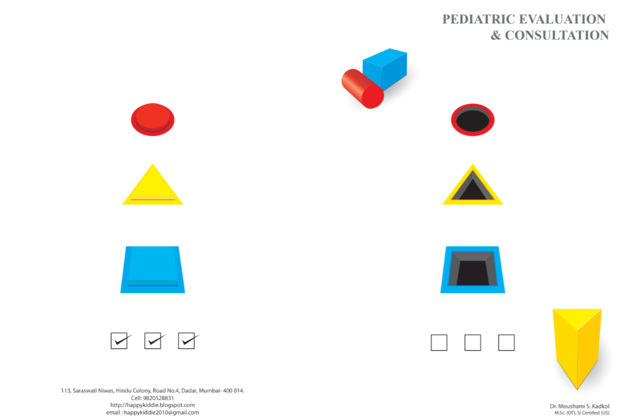 Comprehensive Occupational Therapy assessments are aimed at understanding the strengths, weakness and difficulties of the child to plan treatment priorities. The assessment is structured and includes use of various formal and informal methods to obtain a baseline evaluation of the child. This session also gives opportunity for the parents to share their concerns and understand how Occupational Therapy program would help their child achieve his maximum potential. The assessment time varies from 90 minutes to 120 minutes depending on the concerns. A formal report of assessment is provided to the parents. The report is a guideline to plan and upgrade therapy goals for present and in future.